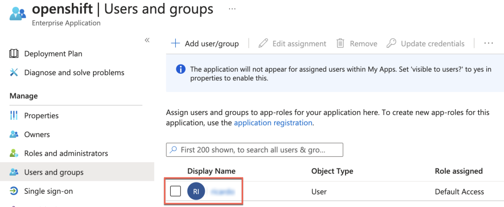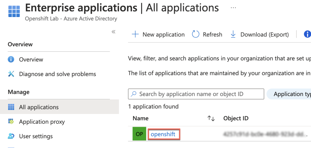 2. Under Enterprise applications, select the application created for the ARO IDP configuration.