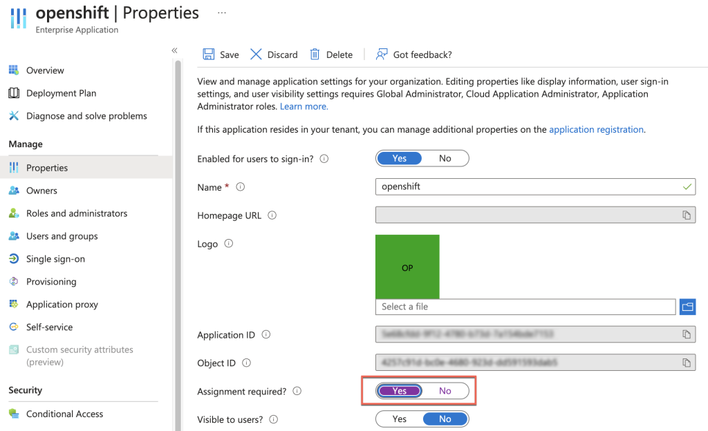 3. In the selected Enterprise application, go to Properties and switch the “Assignment required?” option to YES.