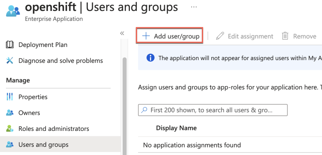 5. To allow access, go to Users and groups in the main blade, click + Add user/group, and add the desired users/groups who should have access to the ARO cluster.